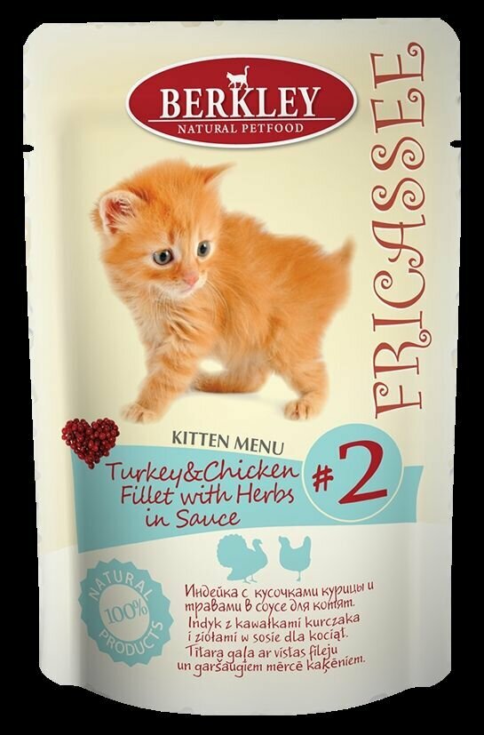 Корм влажный Berkley пауч. для котят №2 Фрикасе Индейка с кусочками курицы и травами в соусе 85г , 12 шт