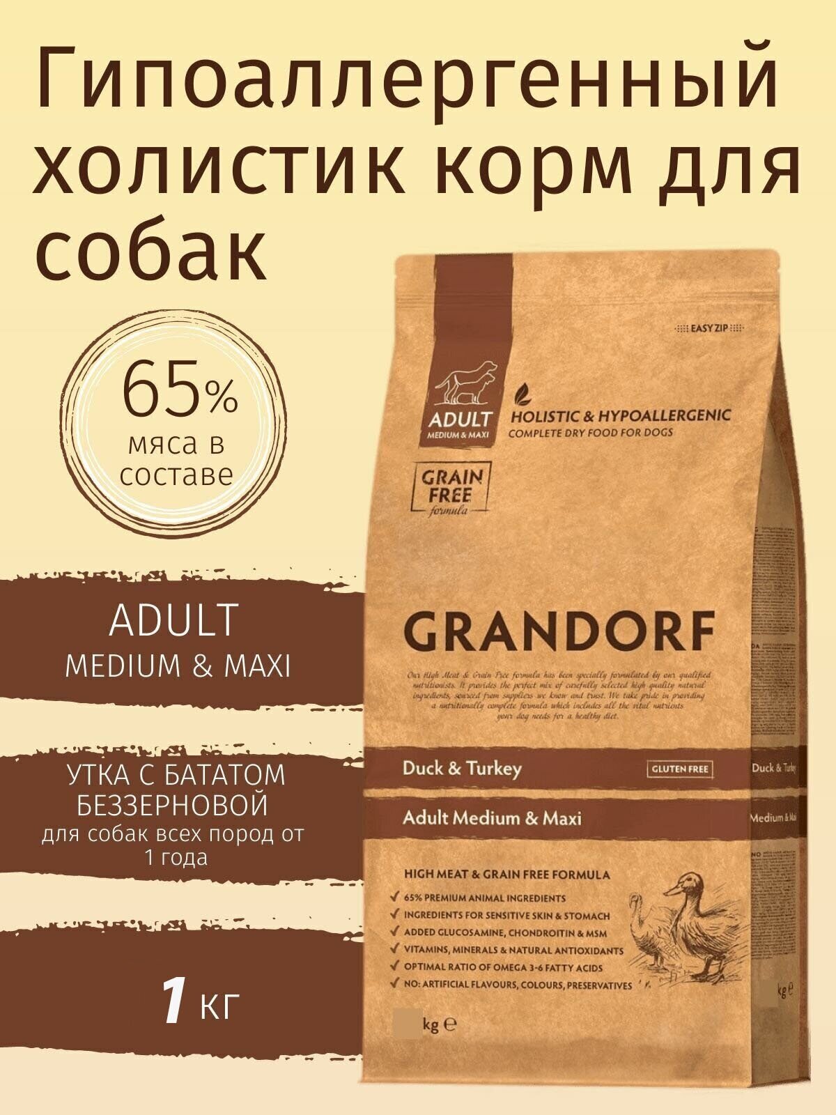 GRANDORF GRAIN FREE DOG ADULT MEDIUM & MAXI DUCK & TURKEY беззерновой для взрослых собак средних и крупных пород с уткой и индейкой (1 кг)