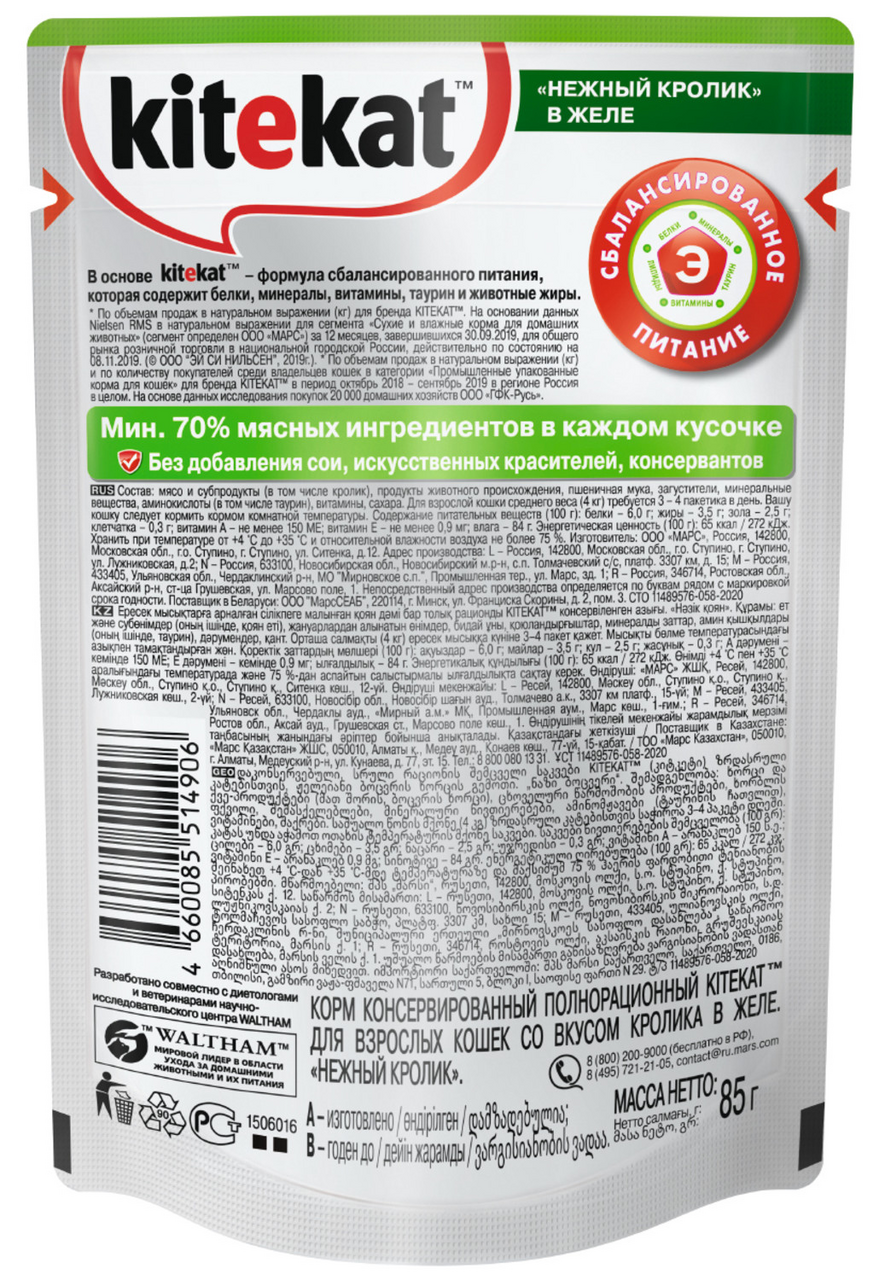 Kitekat Паучи Нежный кролик в соусе для кошек 10151308 10227783 0,085 кг 25122 (18 шт)