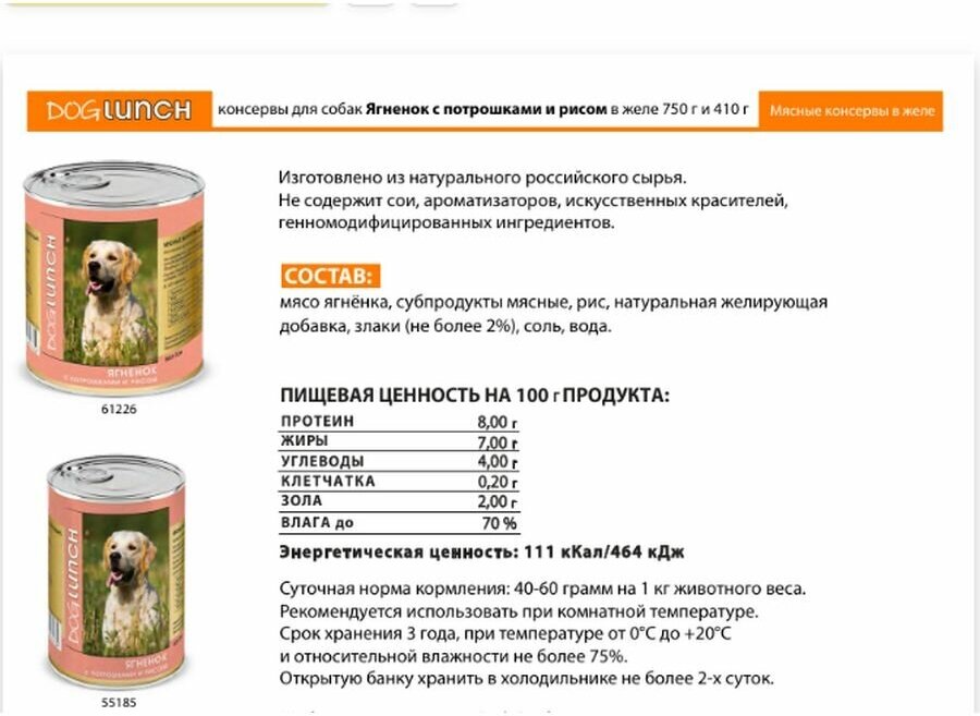 Корм влажный DOG LUNCH ягненок с потрошками и рисом в желе для собак (410г) 132 ₽ Подробнее
