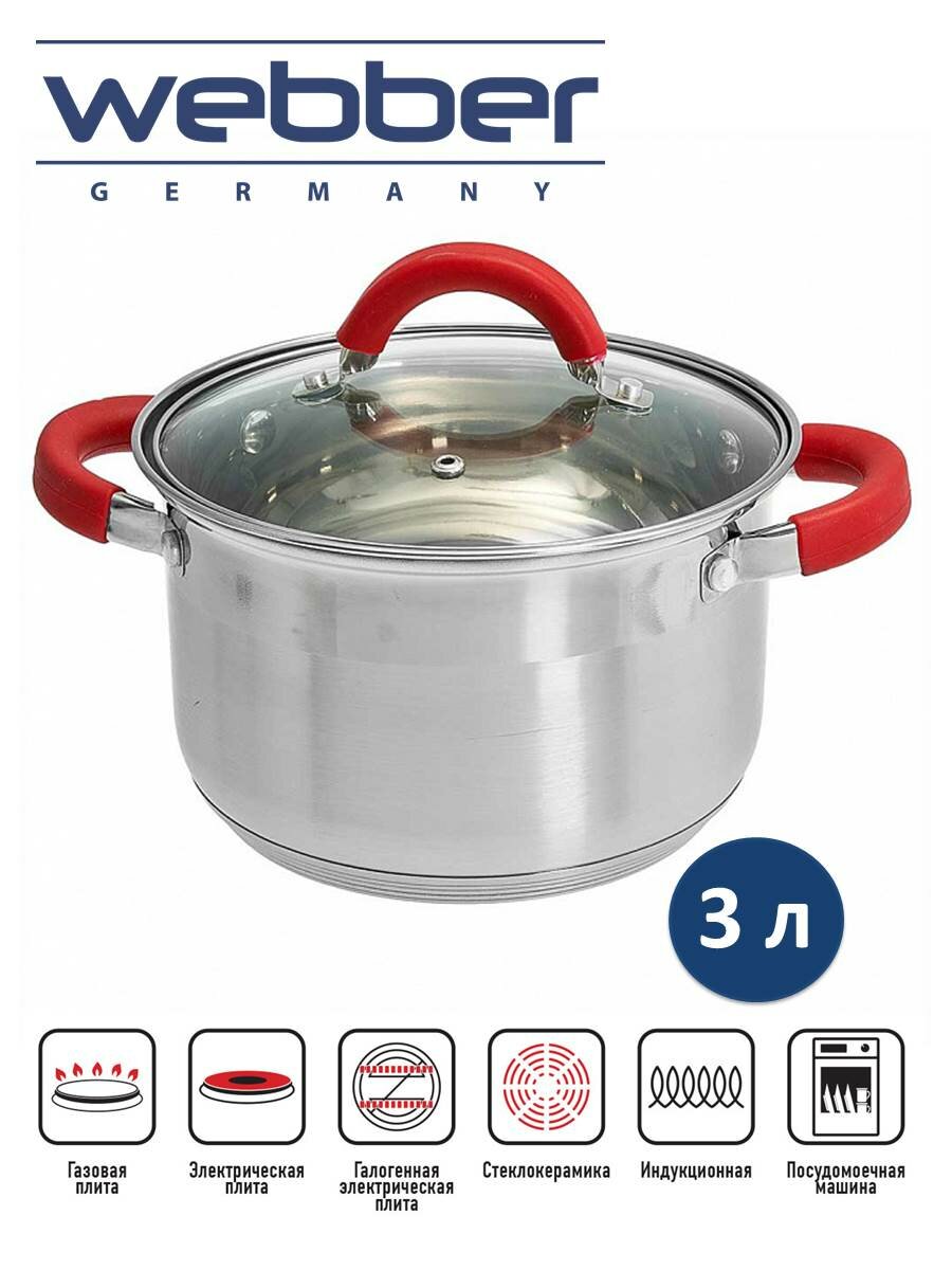 Кастрюля Webber BE-112/2, из нержавеющей стали со стеклянной крышкой, 4 литра