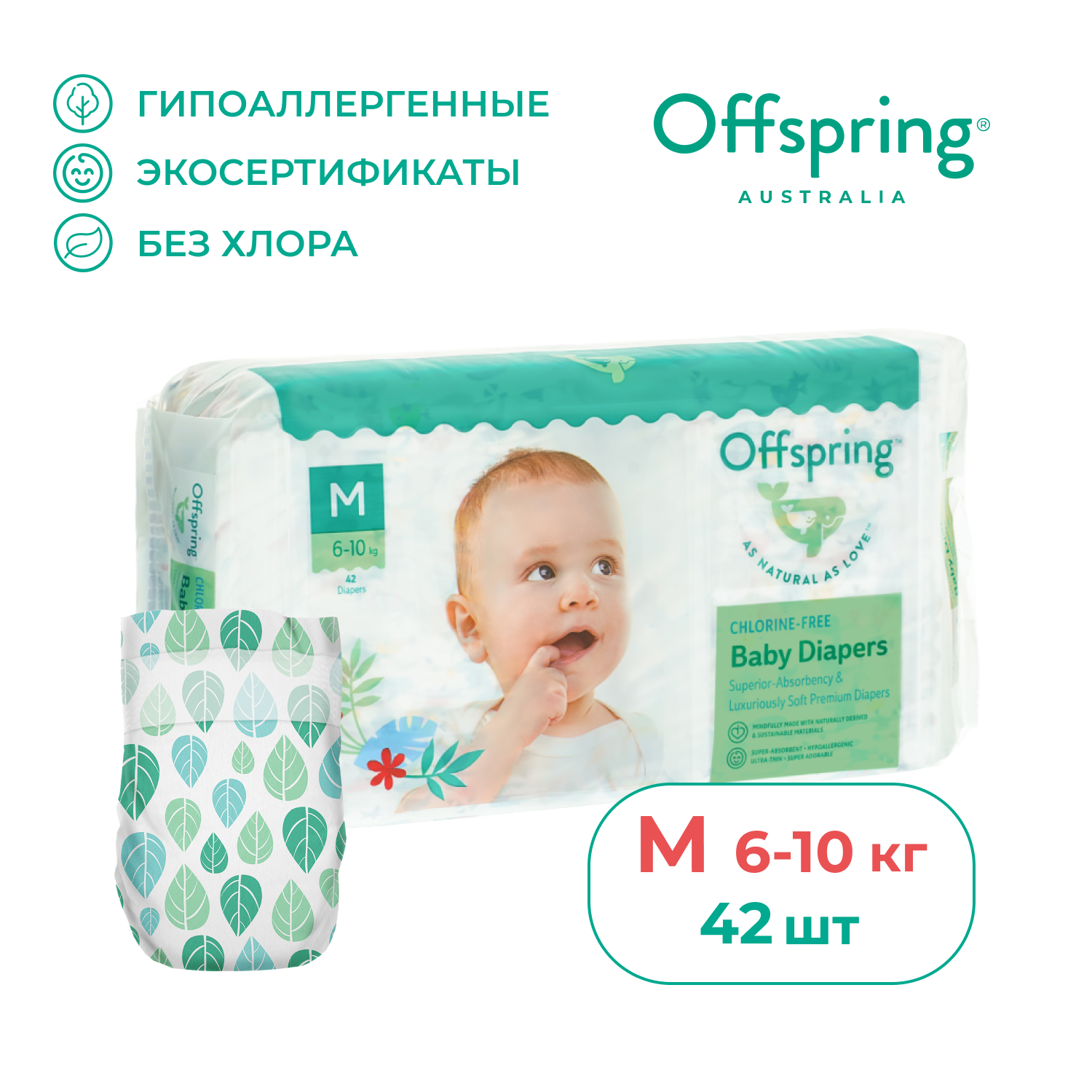 Offspring подгузники, M 6-10 кг. 42 шт. расцветка Листочки, OF01M42L