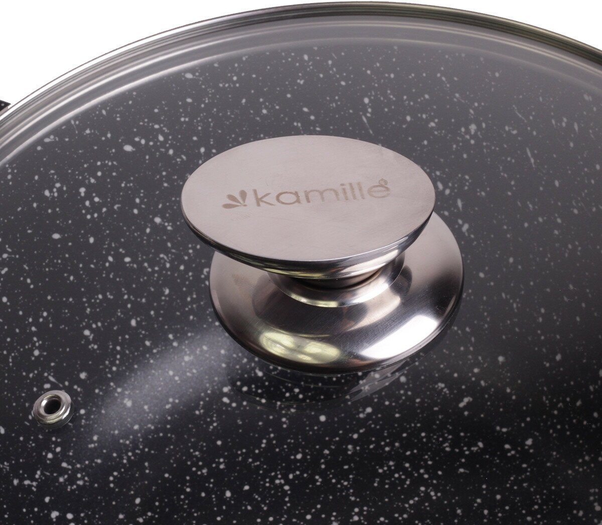 KM-4408 Кастрюля 28х20 см. из литого алюминия с антипригарным покрытием "чёрный мрамор" и стеклянной крышкой Kamille Kamille