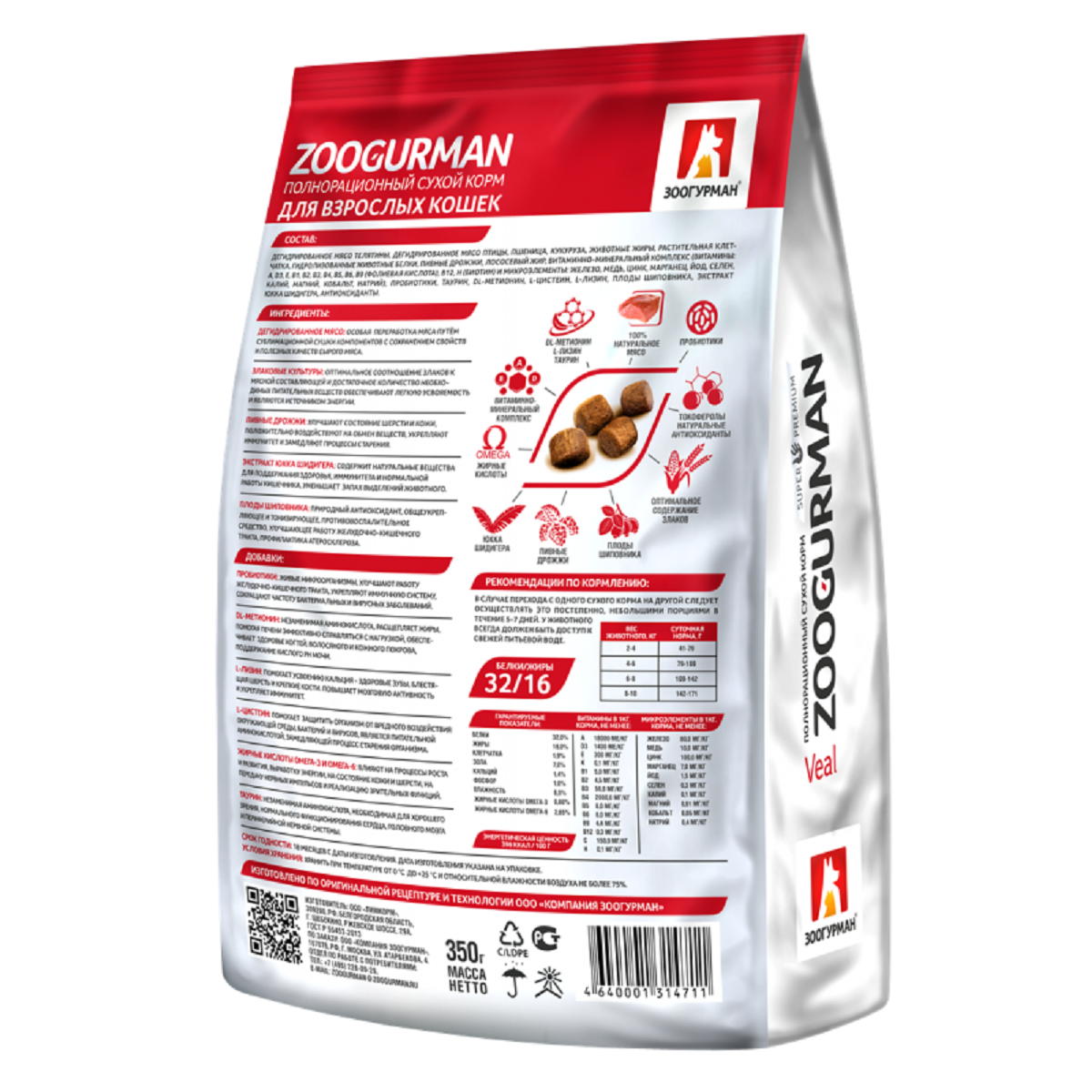 Зоогурман полнорационный сухой корм для кошек, с телятиной - 350 г