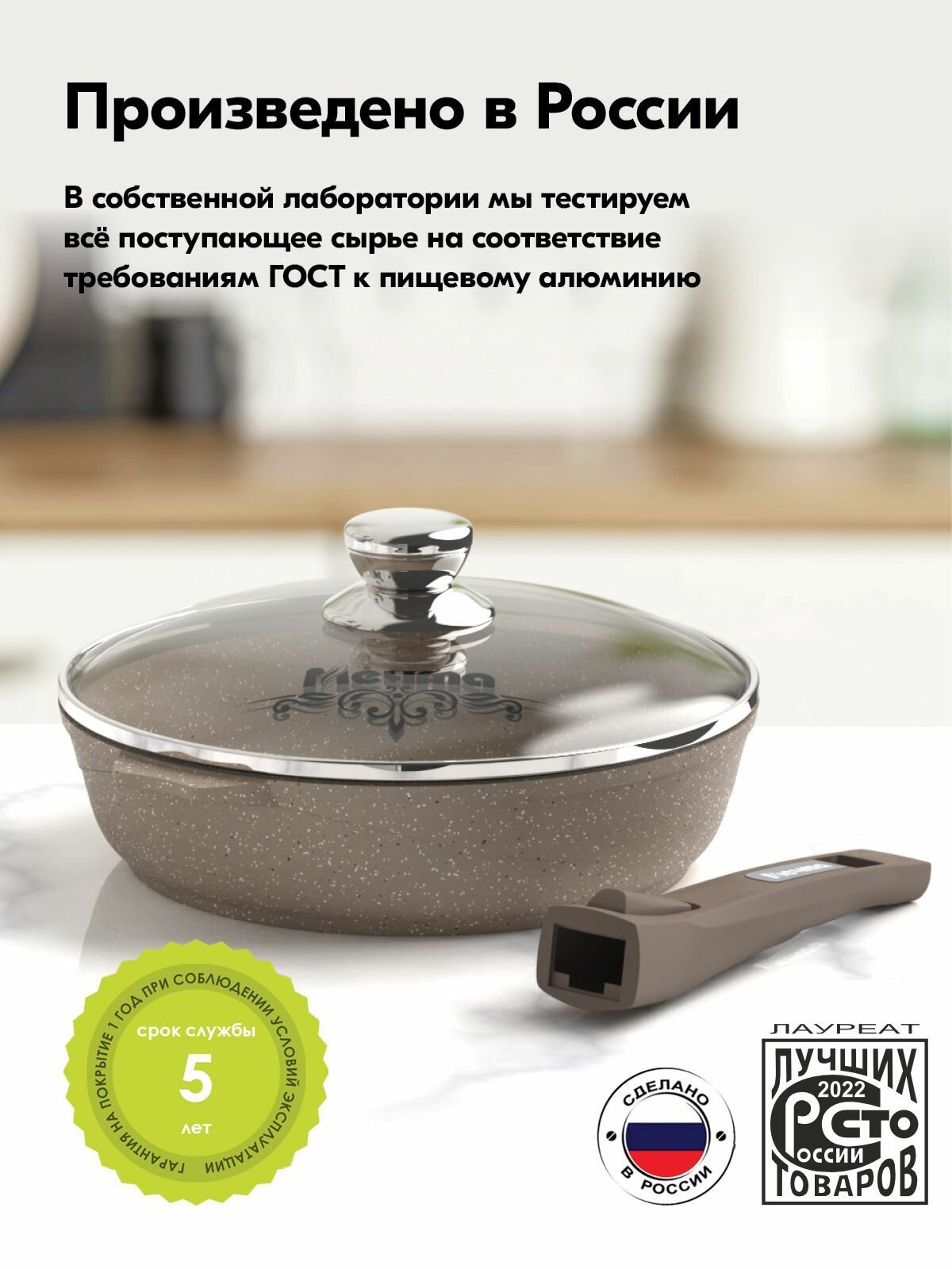 Сковорода с гранитным антипригарным покрытием крышкой и съемной ручкой 24 см Мечта