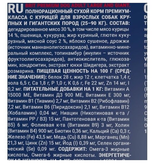 Корм Brit Premium Adult Large & Giant для собак крупных и гигантских пород, с курицей, 15 кг