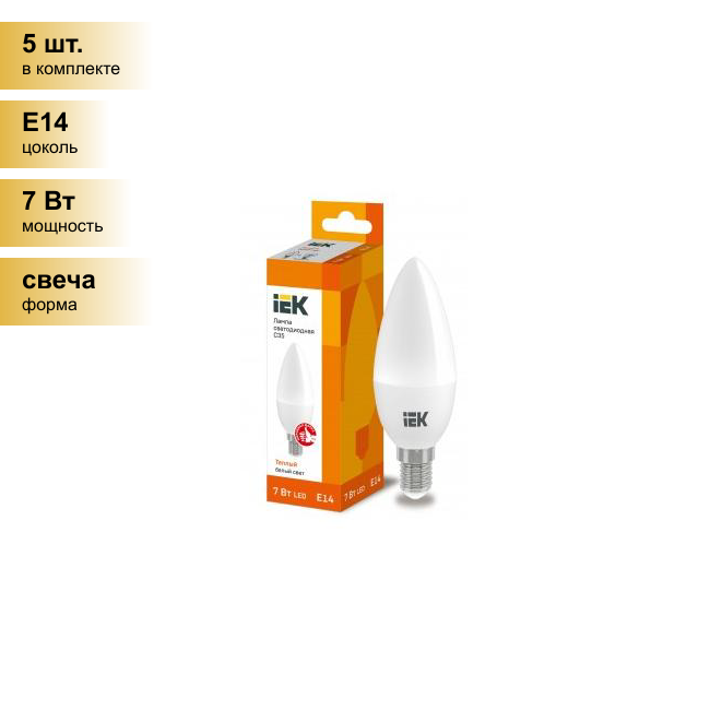 Лампочки (5 шт.) Светодиодная лампочка IEK свеча C35 E14 7W(630lm) 3000K 2K 100x35 матов. ECO LLE-C35-7-230-30-E14 . Цоколь E14