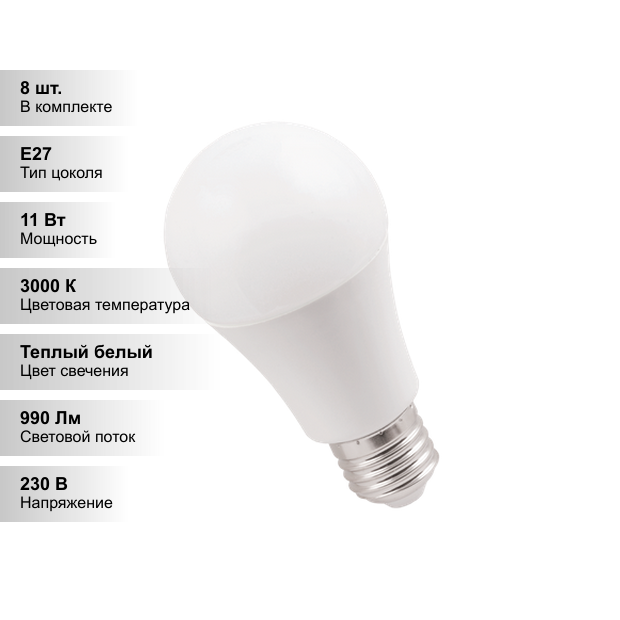 Лампочки (8 шт.) Светодиодная лампочка IEK A60 11Вт 230В 3000К E27