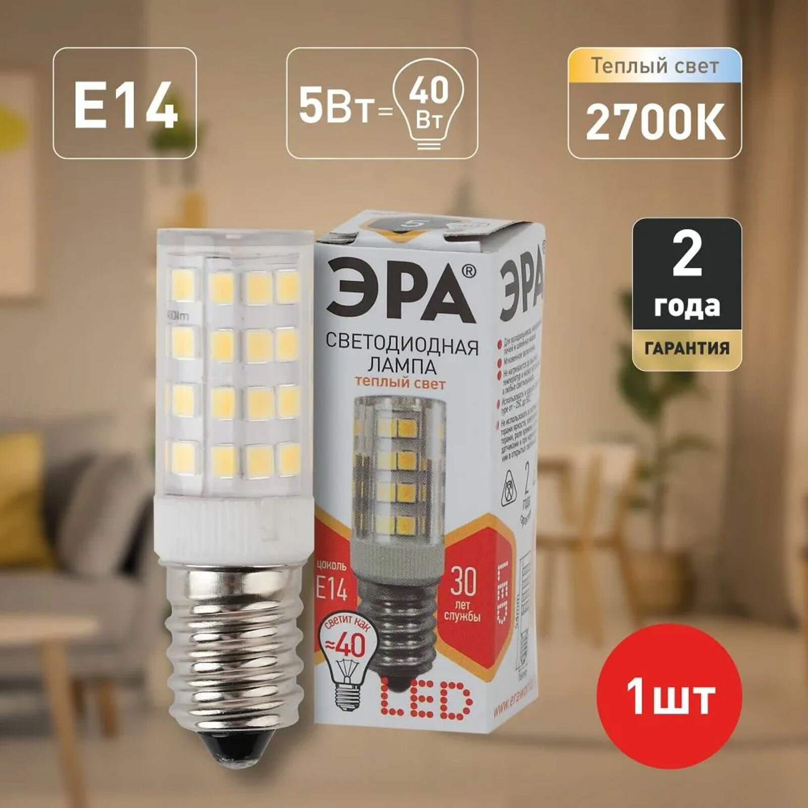 Лампа для холодильника 5Вт Е14 (диодная) ЭРА тёплая, форма-кукуруза Б0033030