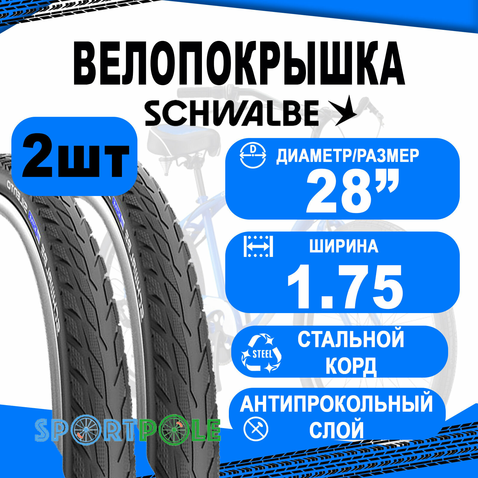 Велопокрышка Комплект покрышек 2шт 28x1.75 (47-622) 05-11100241.01 SILENTO K-Guard B/B-SK+RT (светоотр полоса) HS421 SBC 50EPI. SCHWALBE