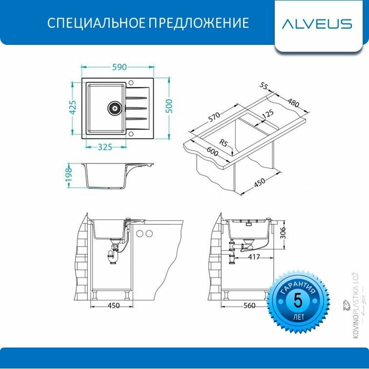 Каменная мойка кухонная врезная с крылом ALVEUS GRANITAL CADIT 10 59 X 50 камень гранит серый
