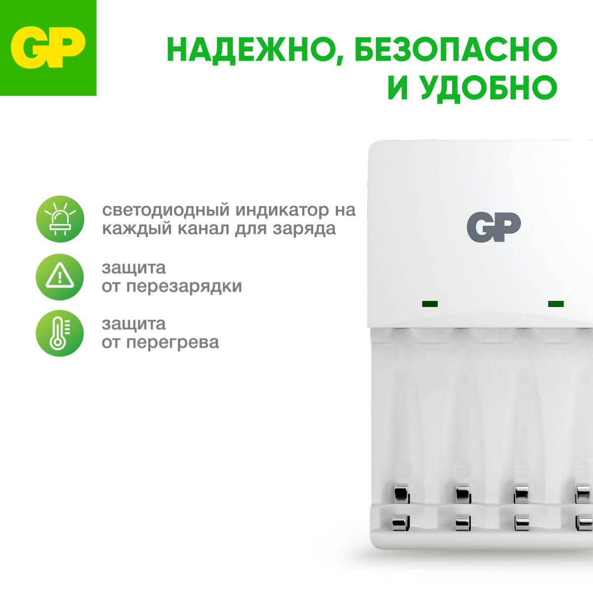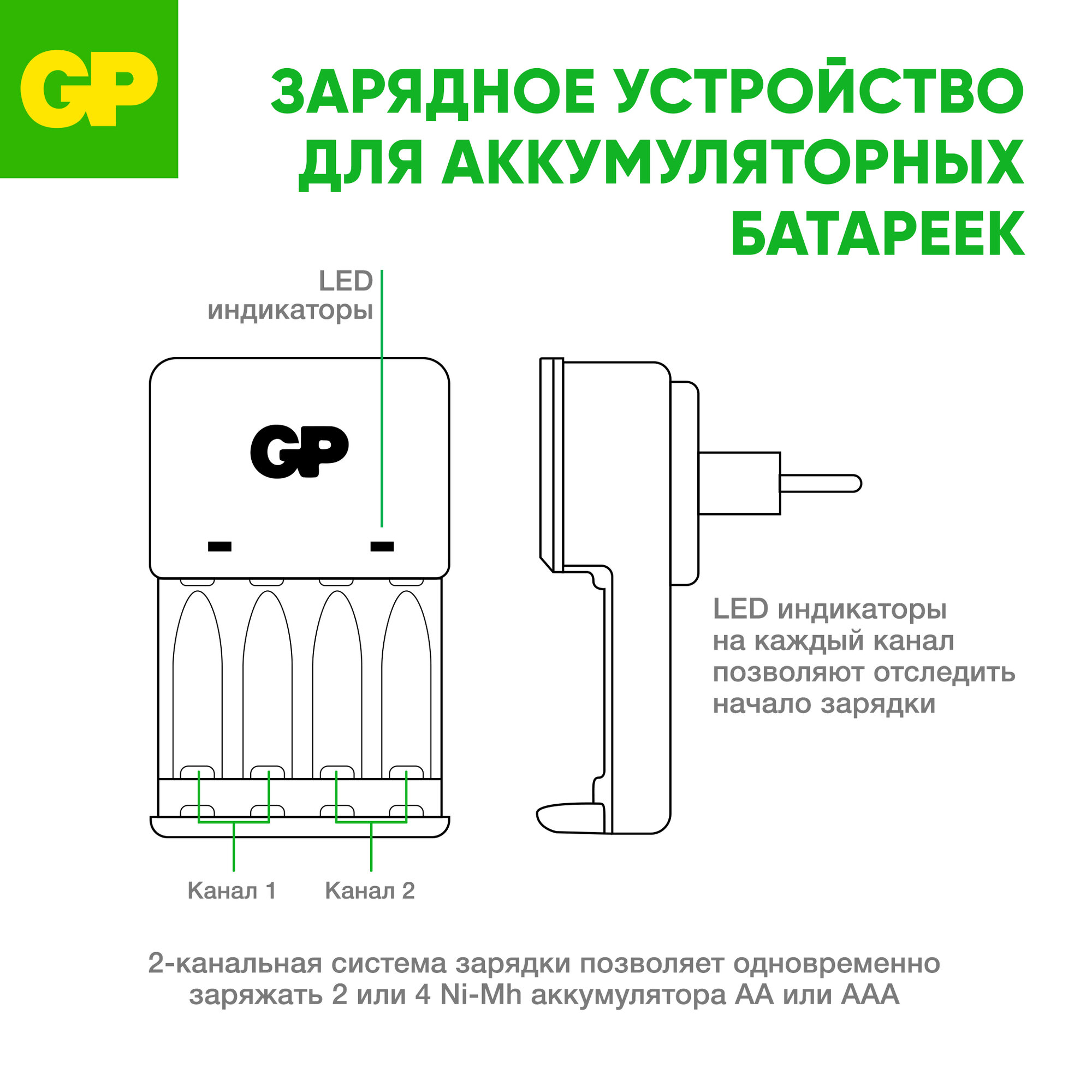 Зарядка аккумуляторных батареек Зарядное устройство GP для аккумуляторных батареек АА и ААА на 4 слота, с аккумуляторами ААА 1000 mAh NiMH, набор 4 шт