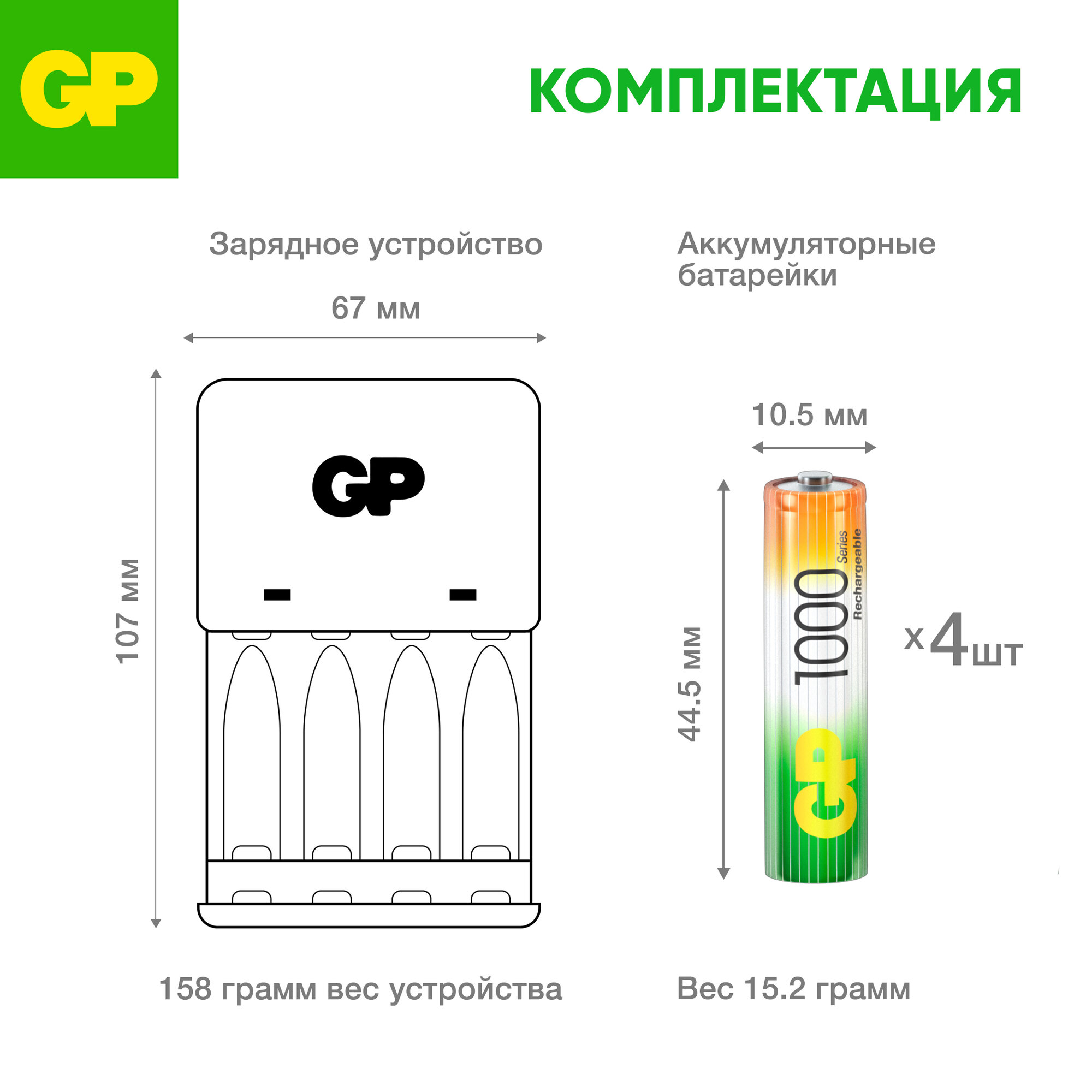 Зарядное устройство + аккумуляторная батарейка GP ААА (HR03) 1000 мАч, 4 шт.