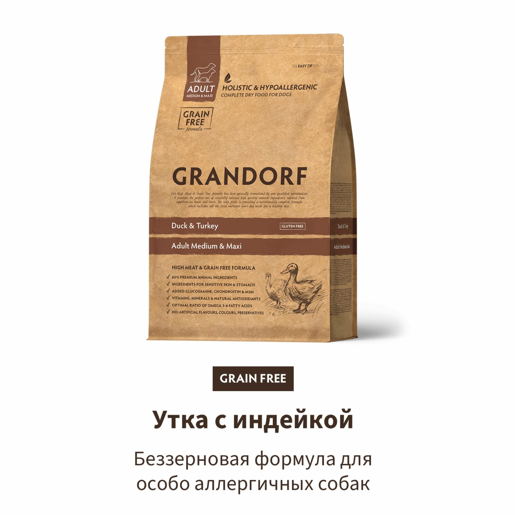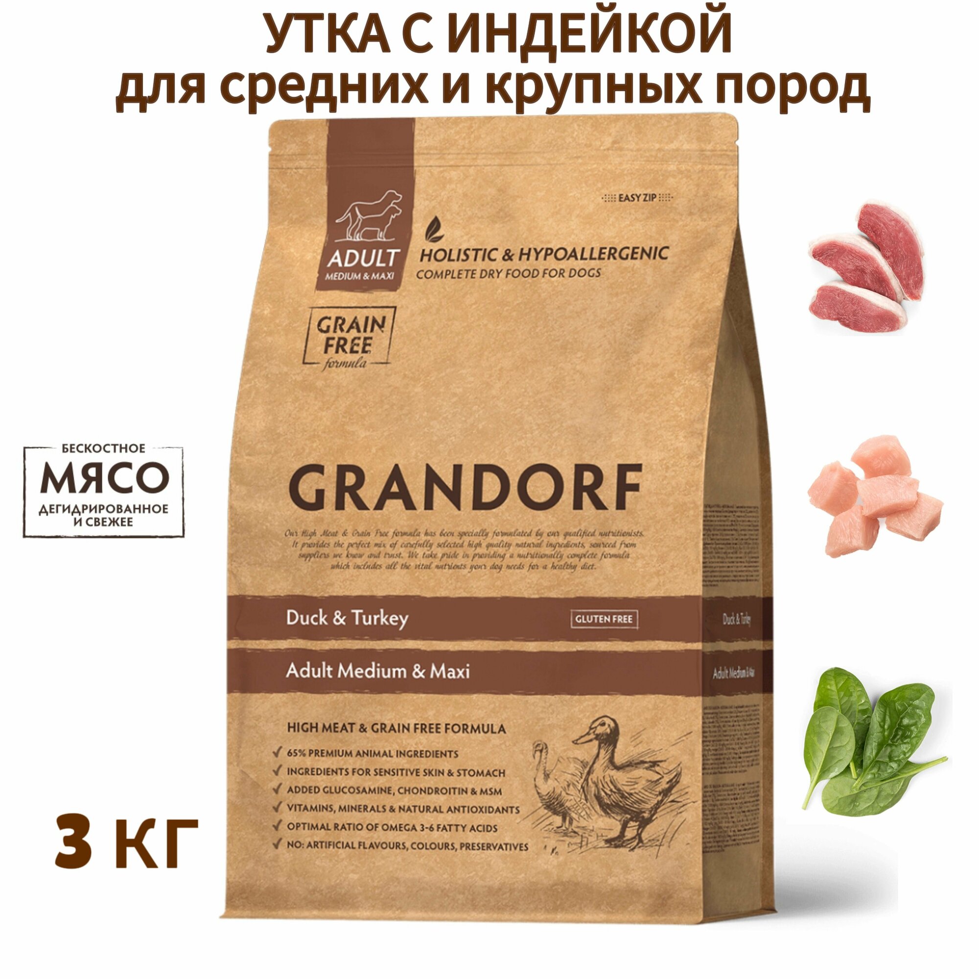 GRANDORF GRAIN FREE DOG ADULT MEDIUM&MAXI DUCK&TURKEY беззерн д взр соб сред и крупн пор утка индейк 3 кг