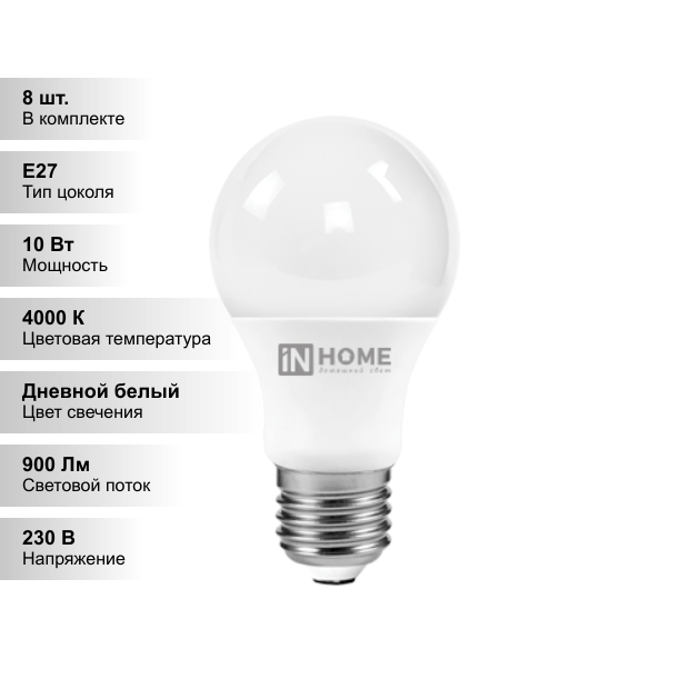 Лампочки (8 шт.) Светодиодная лампочка IN HOME A60 10Вт 230В 4000К Е27 900Лм