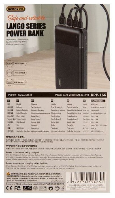 Внешний аккумулятор Remax RPP-166 Lango Power Bank, 2.1A, (20000mAh), черный 6972174154855