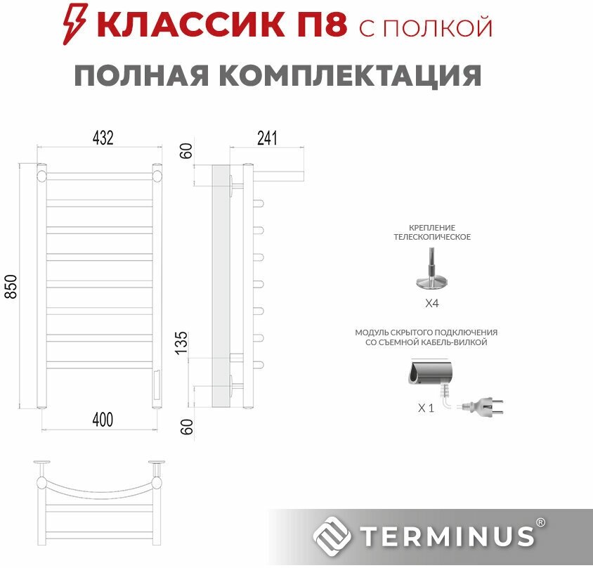 Полотенцесушители Полотенцесушитель электрический с полкой TERMINUS (Терминус) Классик с полкой П8 400х850 мм, сверхпрочная пищевая нержавеющая сталь, диммер 5-ого поколения Quick Touch, гарантия 5 лет