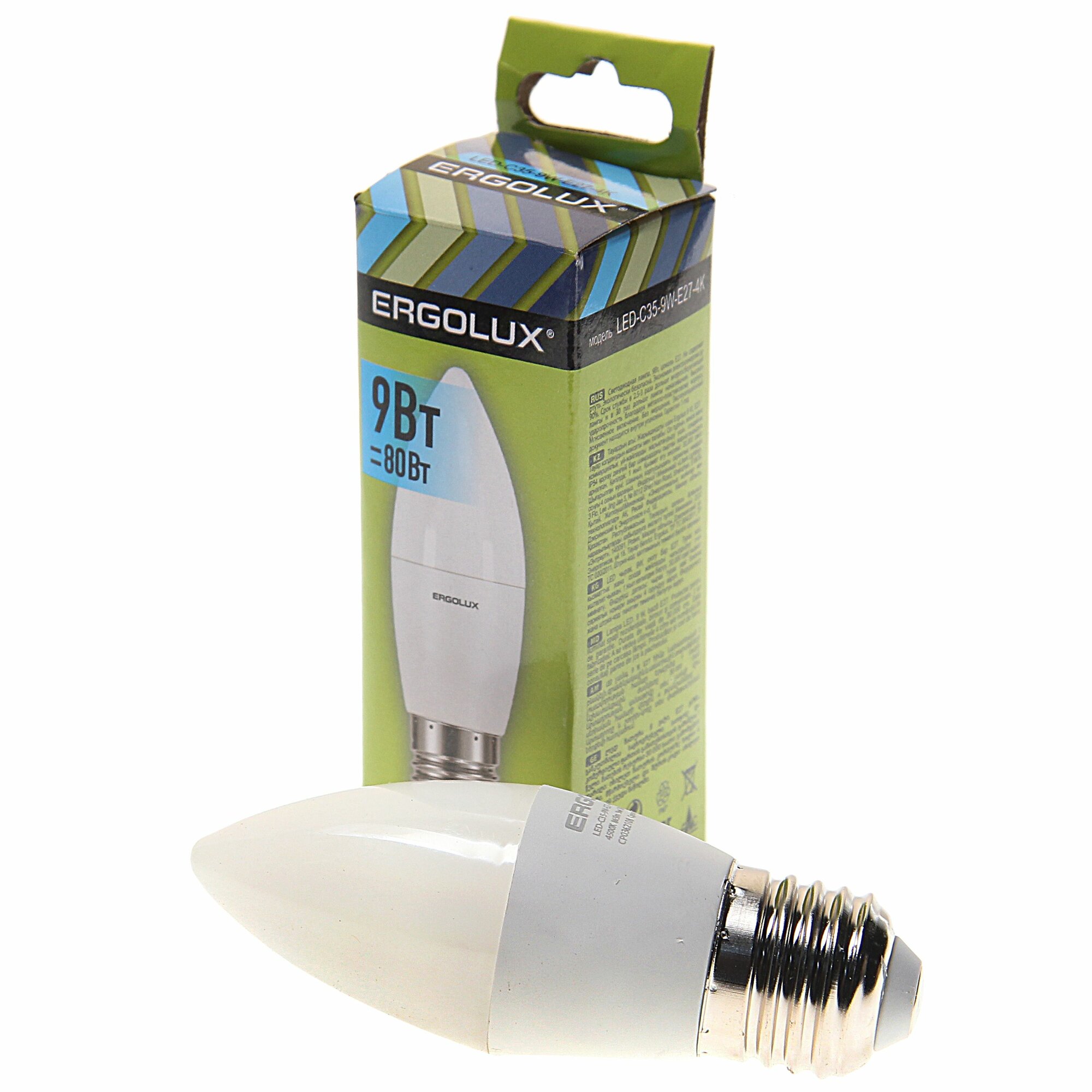 Лампа светодиодная Е27 C35 9W (80W) 220V холодный, LED-C35-9W-E27-6K, ERGOLUX