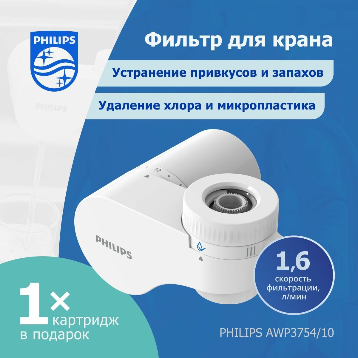 Фильтры для воды Фильтр для очистки воды на кран Philips AWP3754/10, скорость 1.6 л/мин, ресурс 1200 л, 3 режима воды, механизм QuickTwist, таймер замены картриджа, белый