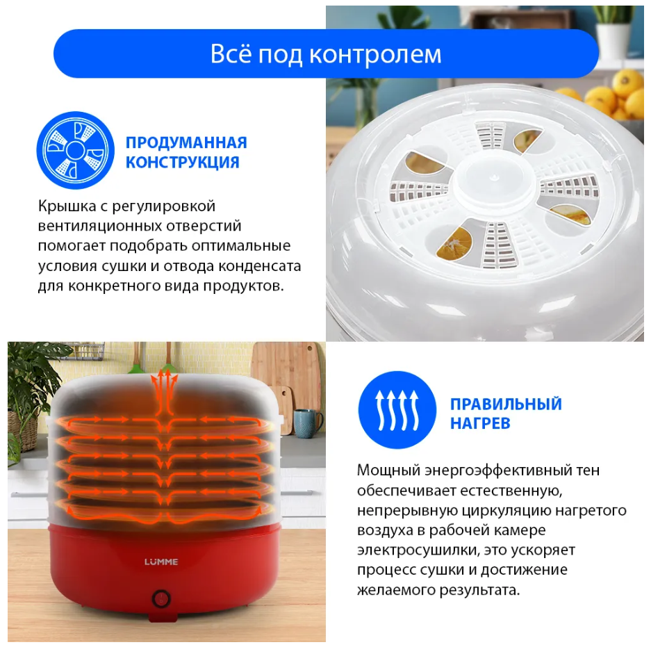 Сушилки фруктов Сушилка для овощей и фруктов/дегидратор для фруктов и овощей LUMME LFD-105PP 20 литров, 5 съемных поддона 200 Ватт красный рубин