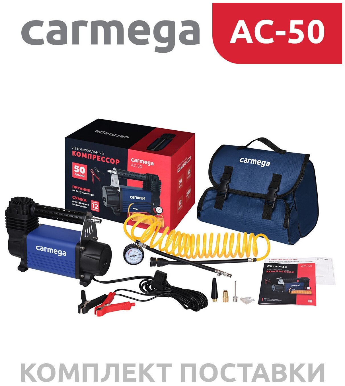 Компрессор автомобильный CARMEGA AC-50 с крокодилами металлический, 50 л/мин с сумкой и съемным шлангом