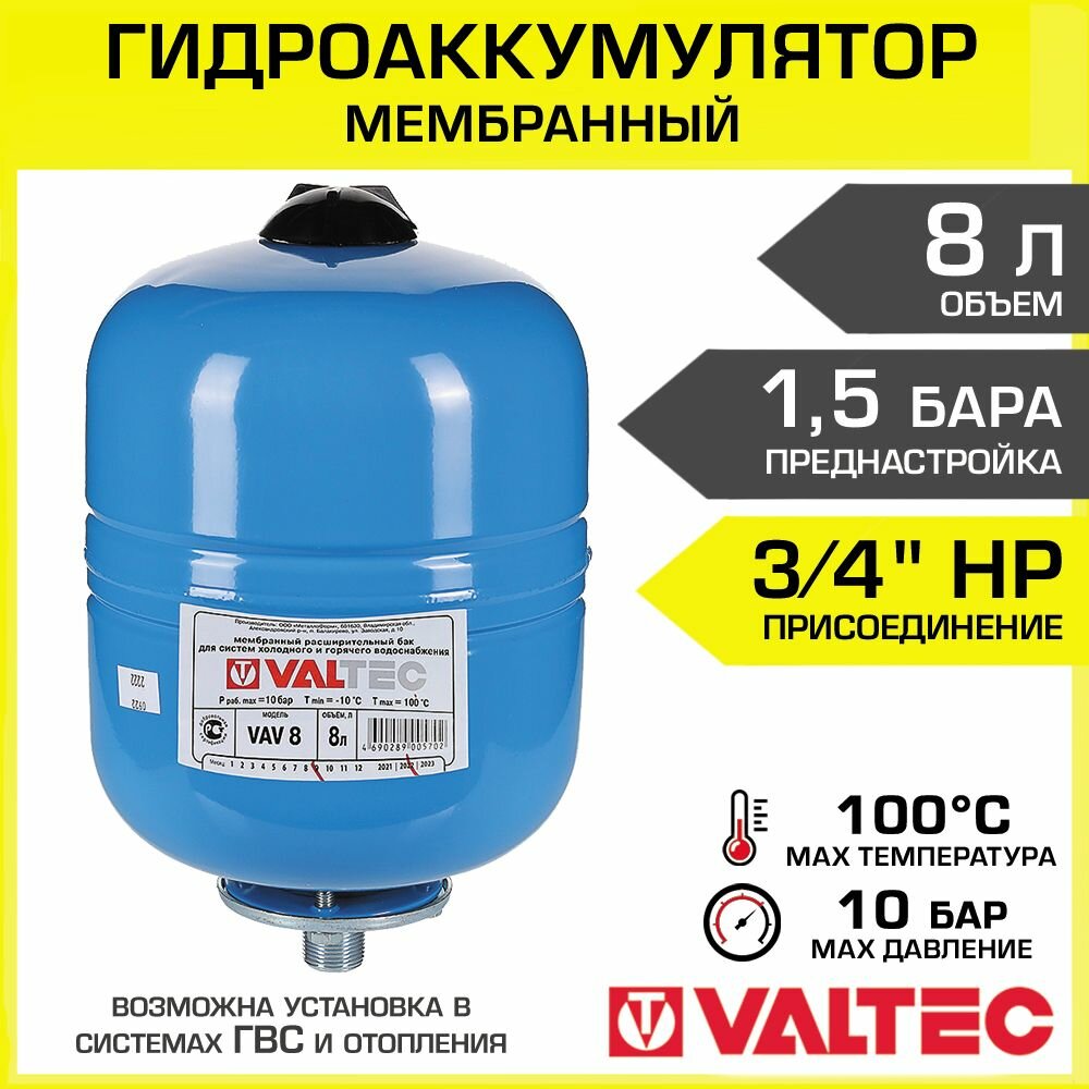 Гидроаккумулятор VALTEC 8 л 1,5 бар вертикальный, подвесной / Расширительный бак мембранный, арт. VT.AV.B.060008