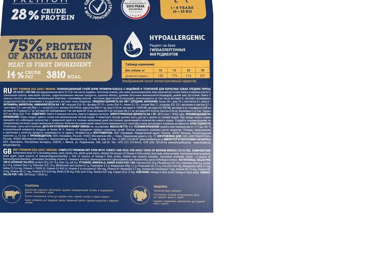 Корм для собак Брит Premium Dog Adult Medium с индейкой и телятиной д/взр. с. средних пород (10–25 кг),15 кг,
