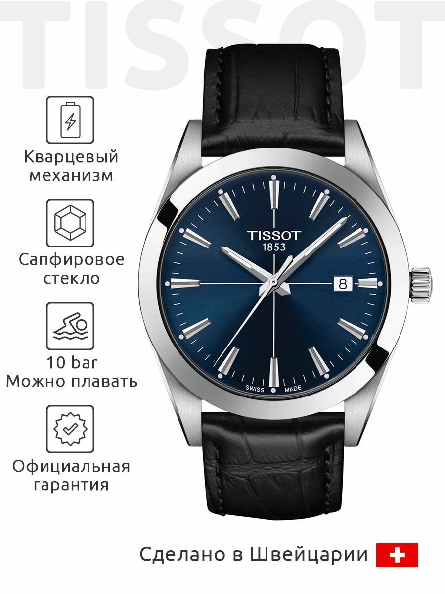 Швейцарские кварцевые часы Tissot Gentleman T127.410.16.041.01 на кожанном браслете, с водозащитой 10 бар и международной гарантией от производителя