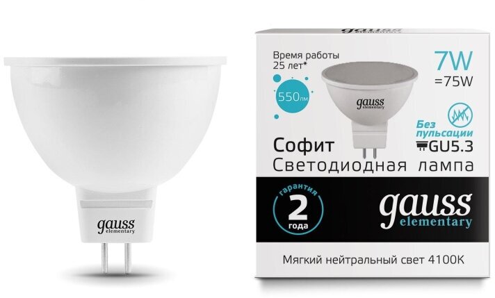(25 шт.) Светодиодная лампочка Gauss MR16, мощность 5.5 Вт, напряжение питания 220 В, цветовая температура 3000 К, теплый белый свет, световой поток 430 Лм, цоколь GU5.3, размер 50х50 мм 7 632 ₽ Подробнее