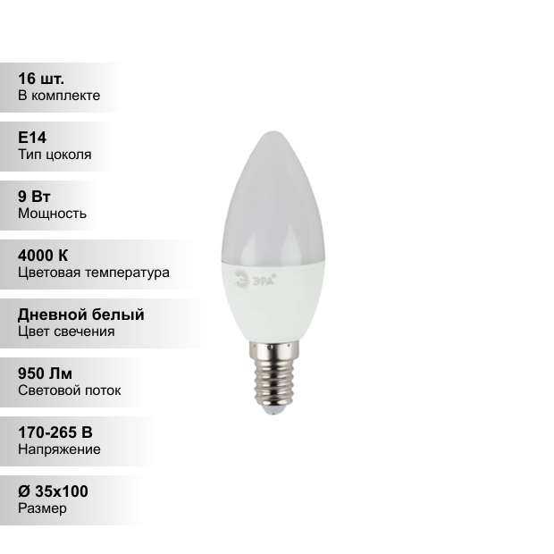 Лампочки (16 шт.) Светодиодная лампочка ЭРА В35 9Вт 170-265В 4000К E14