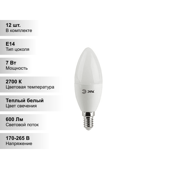 Лампочки (12 шт.) Светодиодная лампочка ЭРА В35 7Вт 170-265В 2700К E14
