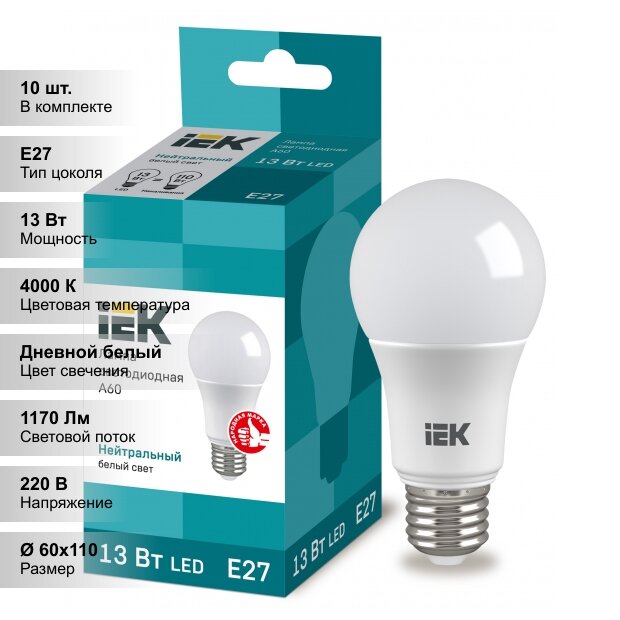 Лампочки (10 шт.) Светодиодная лампочка IEK A60 13Вт 230В 4000К E27