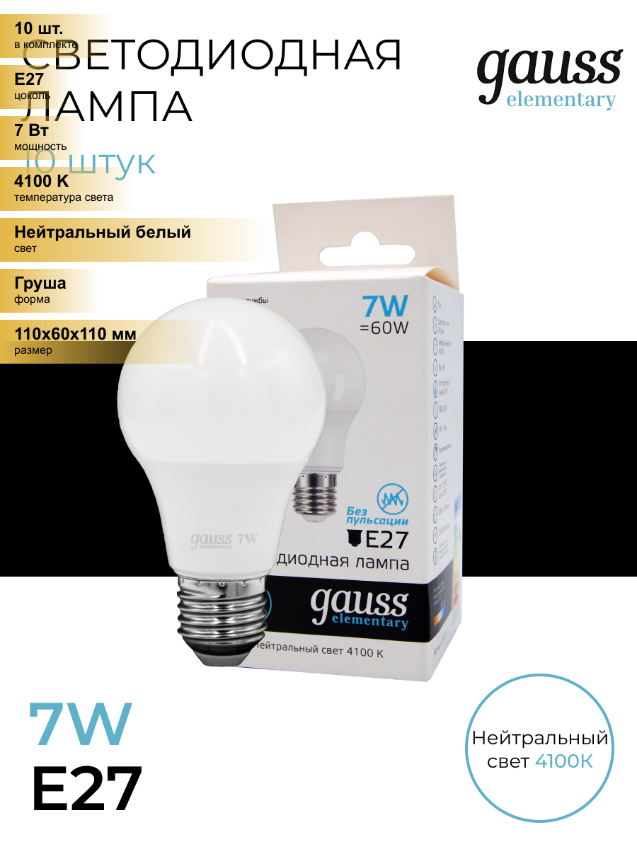 Лампочки (10 шт.) Светодиодная лампочка Gauss Elementary ЛОН A60/A55 E27 7W(540lm) 4100K 4K 110х60 матовая, пластик/алюм. 23227А Нейтральный белый. Цоколь E27