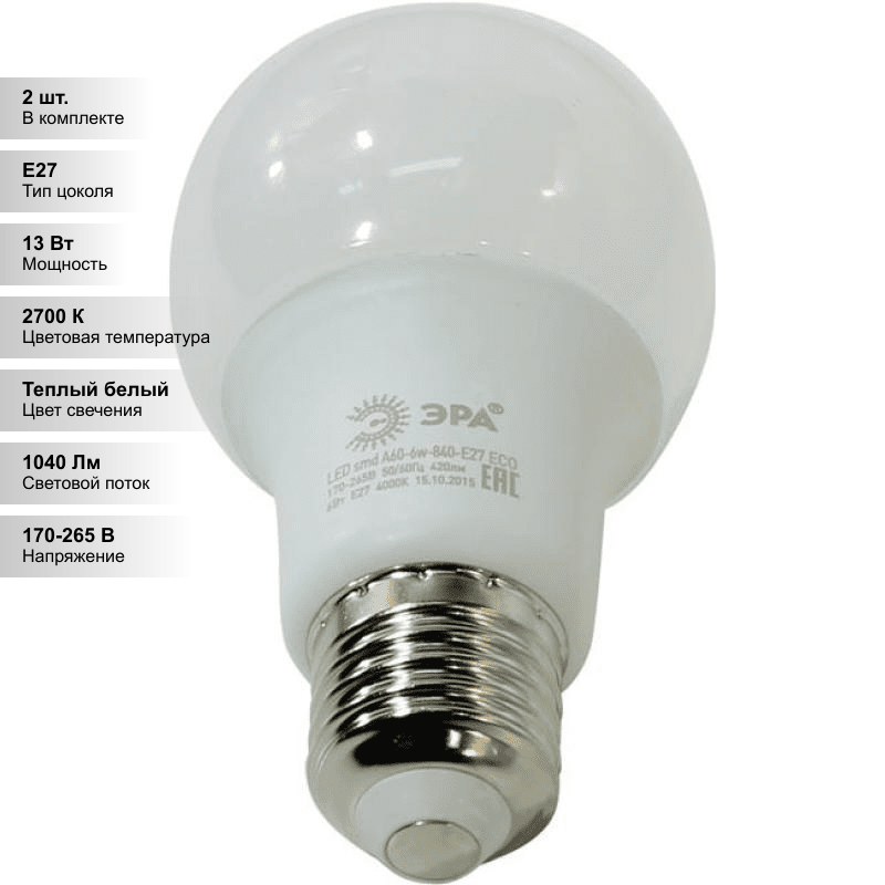 Лампочки (2 шт.) Светодиодная лампочка ЭРА A60 13Вт 170-265В 2700К E27