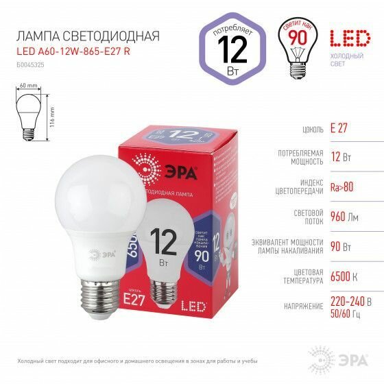 Лампа светодиодная ЭРА Б0045325, E27, A60, 12 Вт, 6500 К