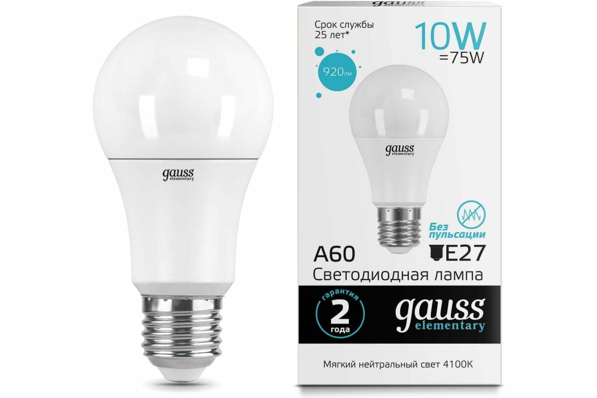 Лампа светодиодная Gauss Elementary A60 10Вт цок.:E27 груша 220B 4100K св.свеч.бел.нейт. (упак.:1шт)