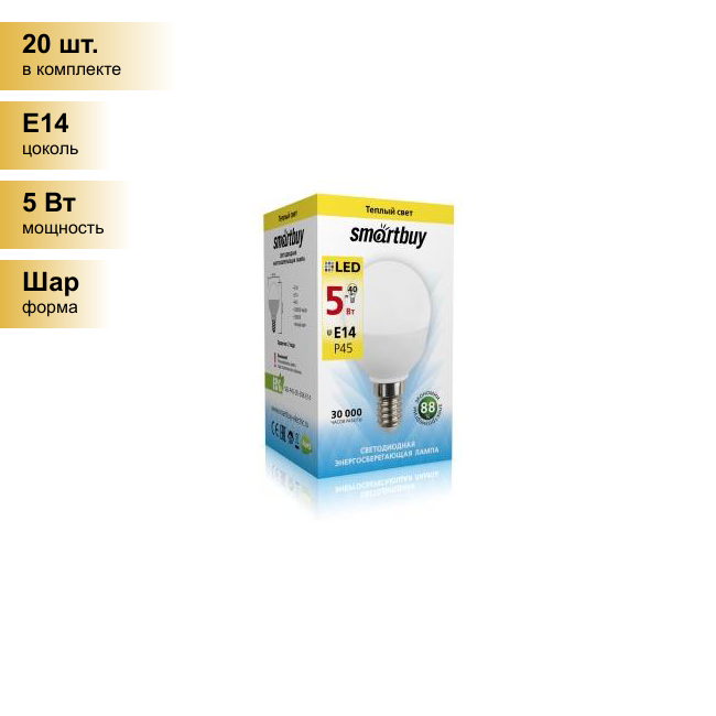 Лампочки (20 шт.) Светодиодная лампочка Smartbuy шар P45 E14 5W(350lm) 3000K 2K матовая пластик SBL-P45-05-30K-E14 . Цоколь E14