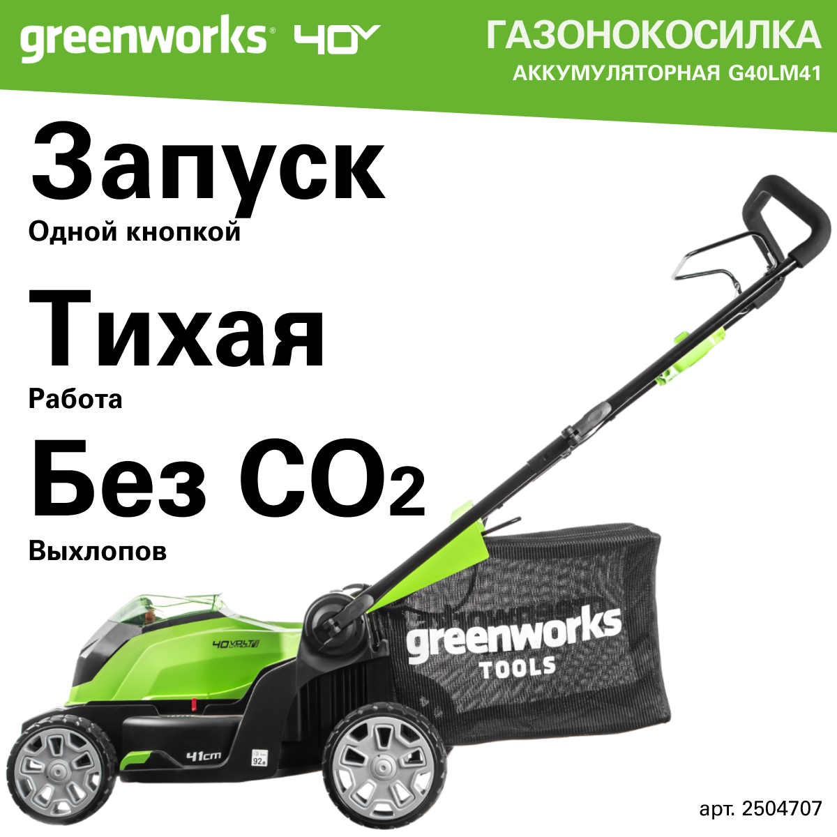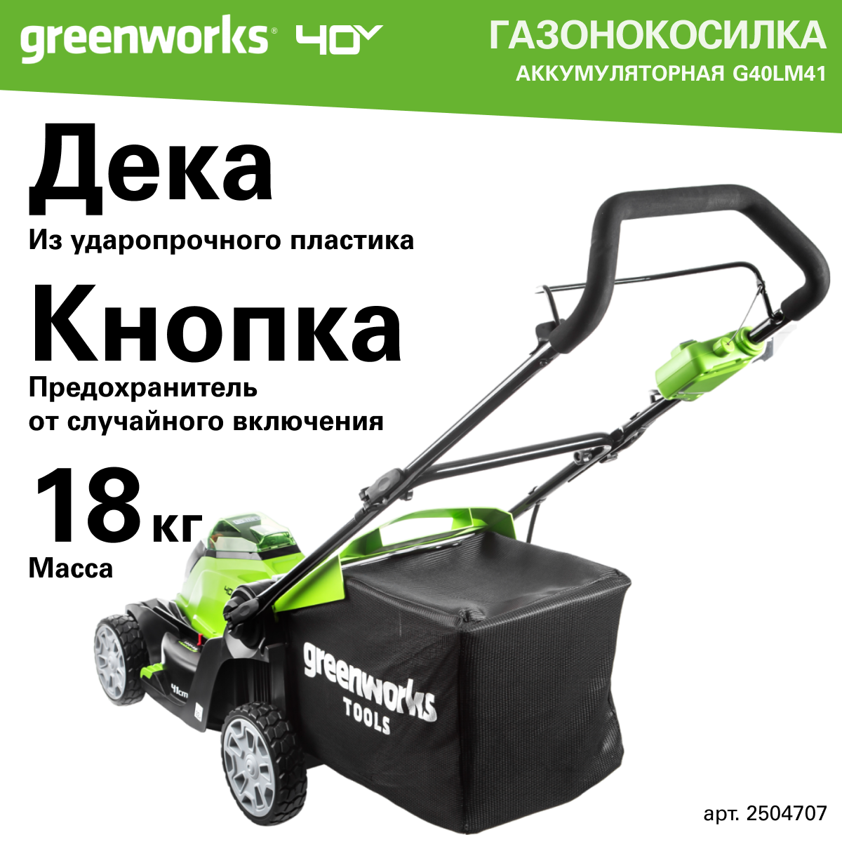 Газонокосилка аккумуляторный GREENWORKS G40LM41 ( 40V, 41 см, 4а/ч и ЗУ) 2504707VB (GREENWORKS)