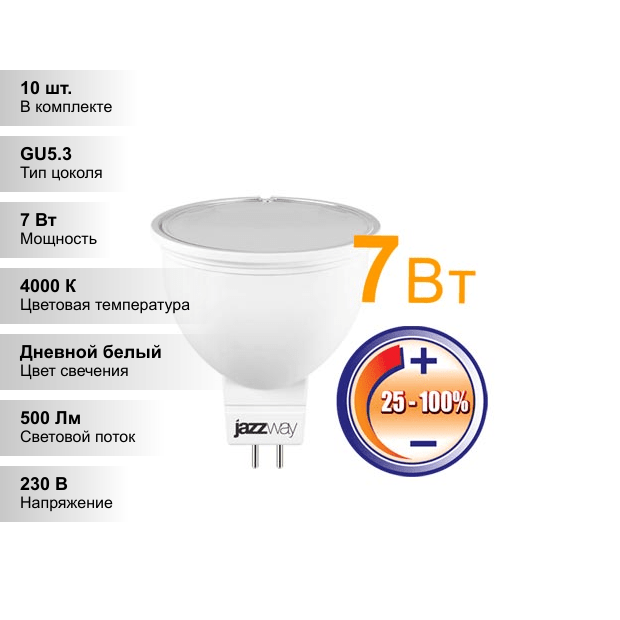 Лампочки (10 шт.) Светодиодная лампочка Jazzway JCDR 7Вт 230В 4000K GU5.3 диммир.
