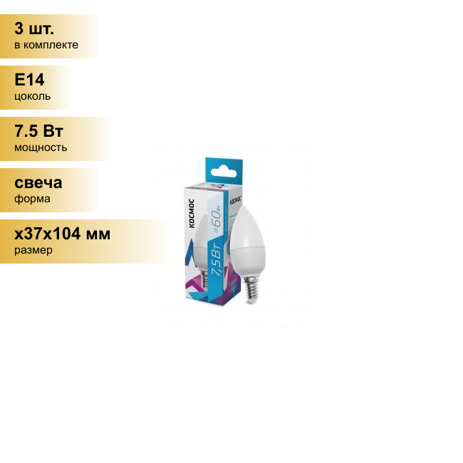 Лампочки (3 шт.) Светодиодная лампочка Космос свеча E14 7,5W (7W) (600lm) 4500K 4K матов. 99x37 LkecLED7.5wCNE1445 . Цоколь E14