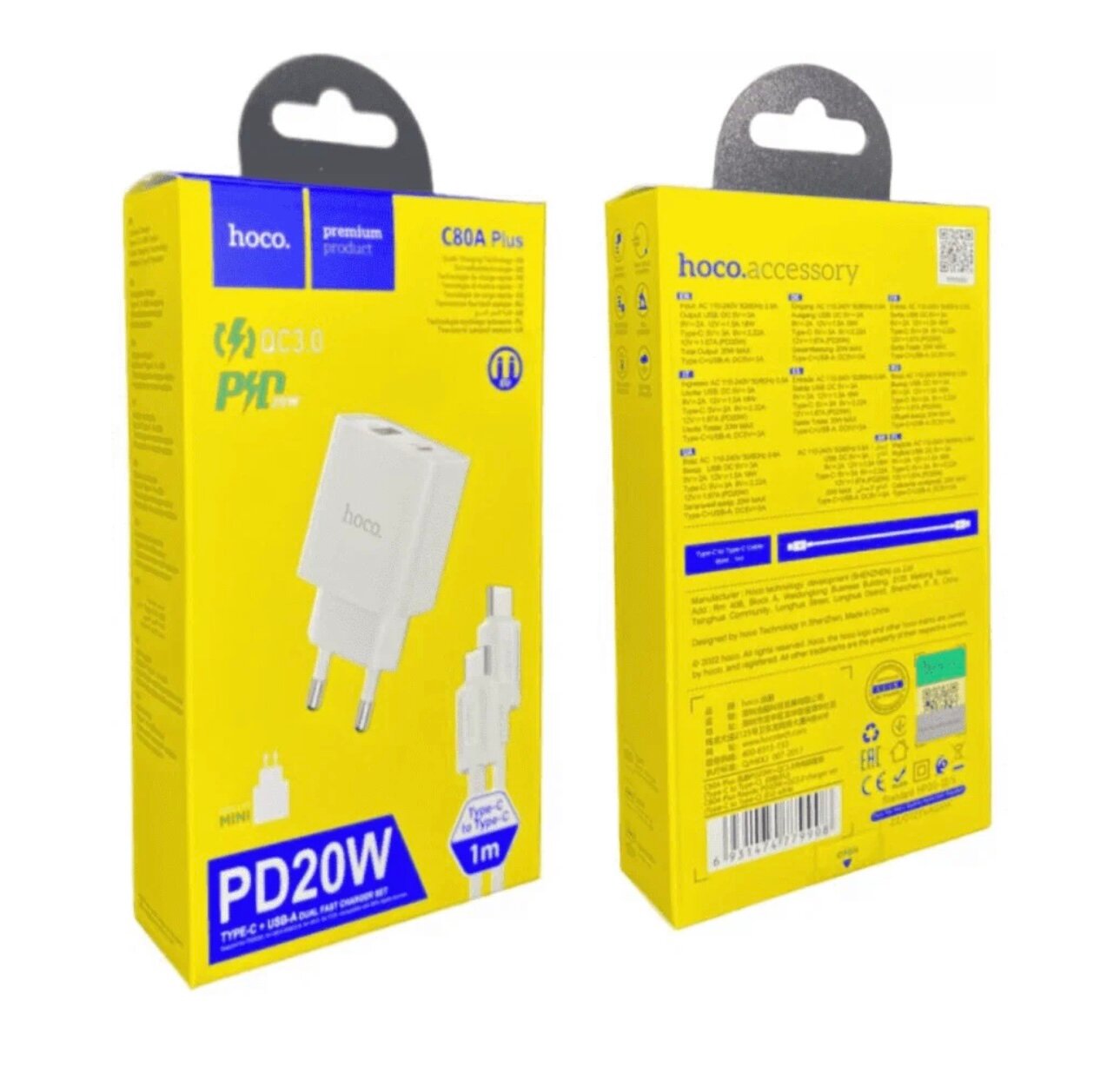 СЗУ HOCO C80A Plus Rapido 1xUSB, 1xUSB-C, 3А, PD20W, QC3.0 USB-C кабель Type-C, 1м (белый)