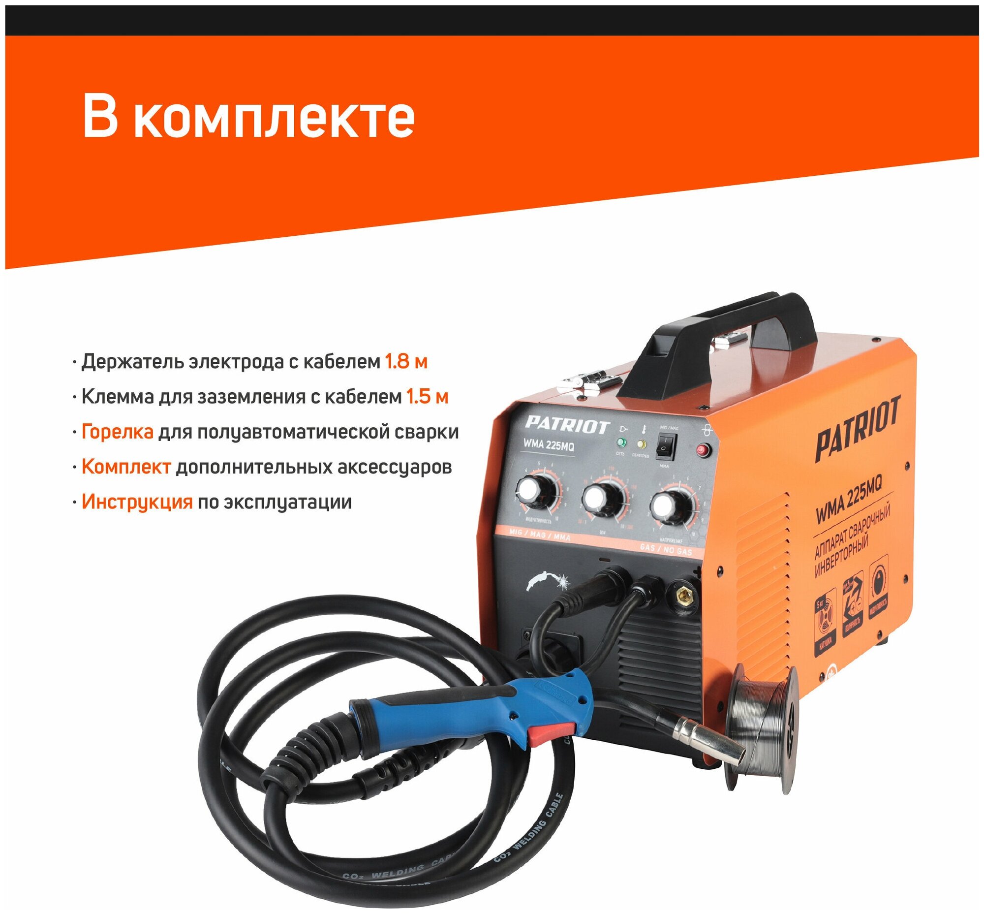 Полуавтомат сварочный инверторный PATRIOT WMA 225MQ MIG/MAG/MMA, полуавтоматическая сварка в среде г