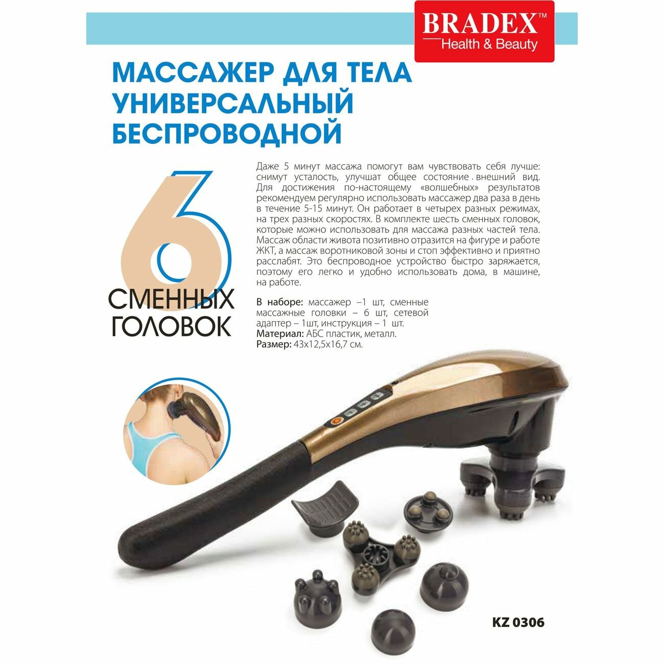 Массажер для тела, ШЕИ, плеч, поясницы И НОГ, С 6 сменными насадками, беспроводной, Bradex