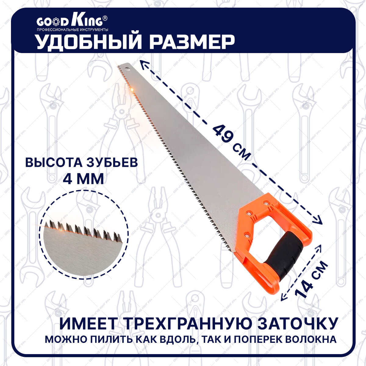 Ножовки Ножовка по дереву GOODKING S-10016, 49 см, пила садовая, ручная, прорезиненная рукоятка, 400 мм