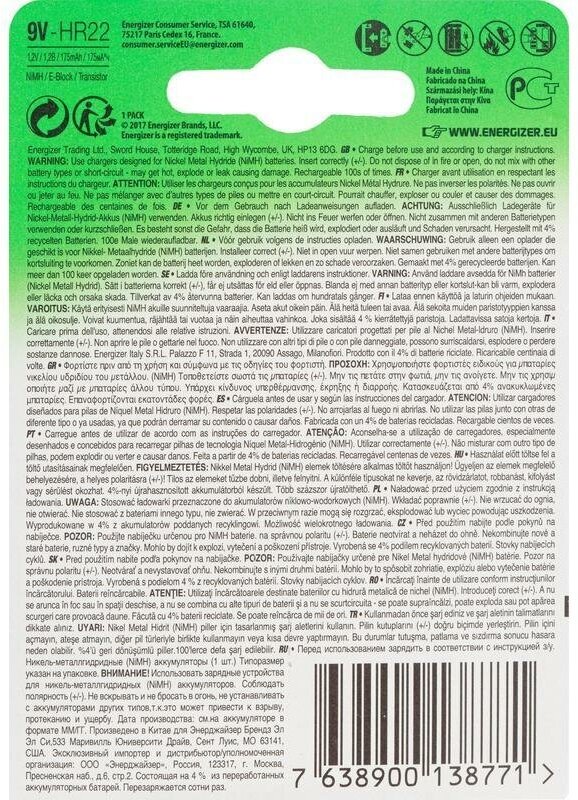 Аккумуляторная батарейка Аккумулятор Ni-Mh 175 мА·ч Energizer Accu Recharge Power Plus 9V Крона, 1 шт.