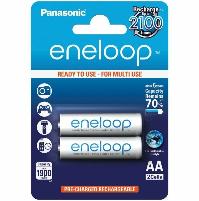 Лучшие цены. Базовая модель никель-металлогидридных аккумуляторов Eneloop Panasonic типоразмера АА отличается стабильным напряжение и высокой работоспособностью в течении всего рабочего цикла. Отстутсттвие эффекта памчти позволяет использовать аккумуляторы после многократной перезарядки – до 2100 раз. Это абсолютный рекорд среди аналогичных аккумуляторов того же типоразмера. Низкий уровень саморазряда дает возможность сохранять до 70% заявленной производителем энергоемкости даже после 5 лет бездействия. Магазины в вашем городе.