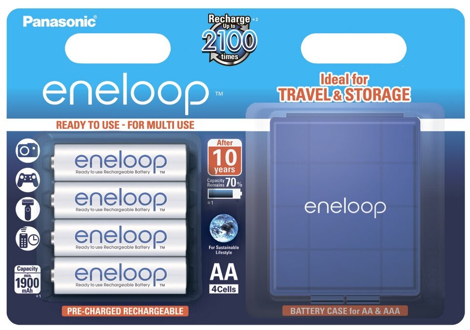 Лучшие цены. Особенности Panasonic Eneloop BK-3MCCEC4BE 1900 mAh с кейсом. Аккумуляторы Eneloop отличаются очень низким саморазрядом, что позволяет им работать долгое время, практически не теряя первоначальных характеристик. Количество циклов заряда-разряда - до 1800. Выпускаются предзаряженными, т.е. можно использовать сразу, открыв упаковку. Не имеют "эффекта памяти". Обладают высокой устойчивостью к морозам, могут работать при температуре -20 градусов. Магазины в вашем городе.