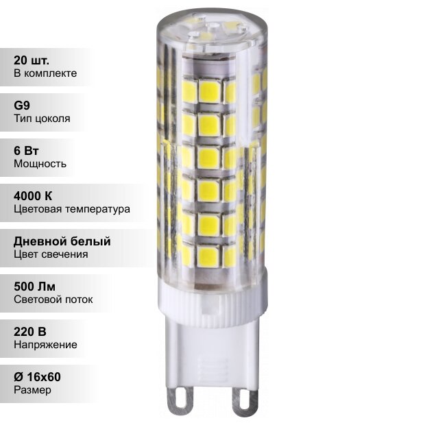 (6 шт.) Светодиодная лампочка Navigator G9, мощность 6 Вт, напряжение питания 220 В, цветовая температура 4000 K, нейтральный белый свет, световой поток 500 Лм, пластик, цоколь G9, размер 15х60 мм 1 495 ₽ Подробнее
