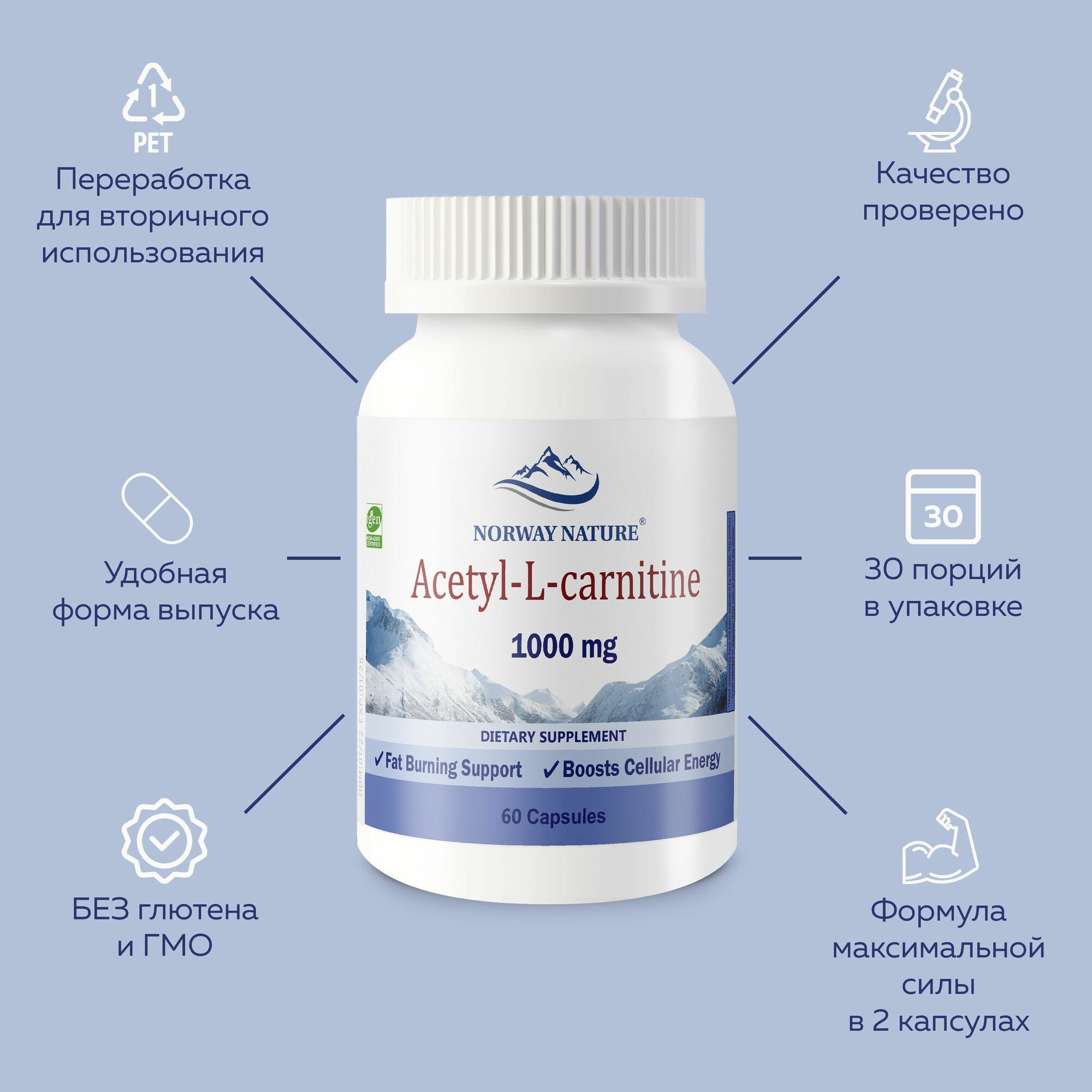 Сжигатели жира Ацетил Л-Карнитин "Norway Nature, Acetyl L-carnitine", 1000 мг, 60 капсул / Для снижения веса, коррекции фигуры, сушки