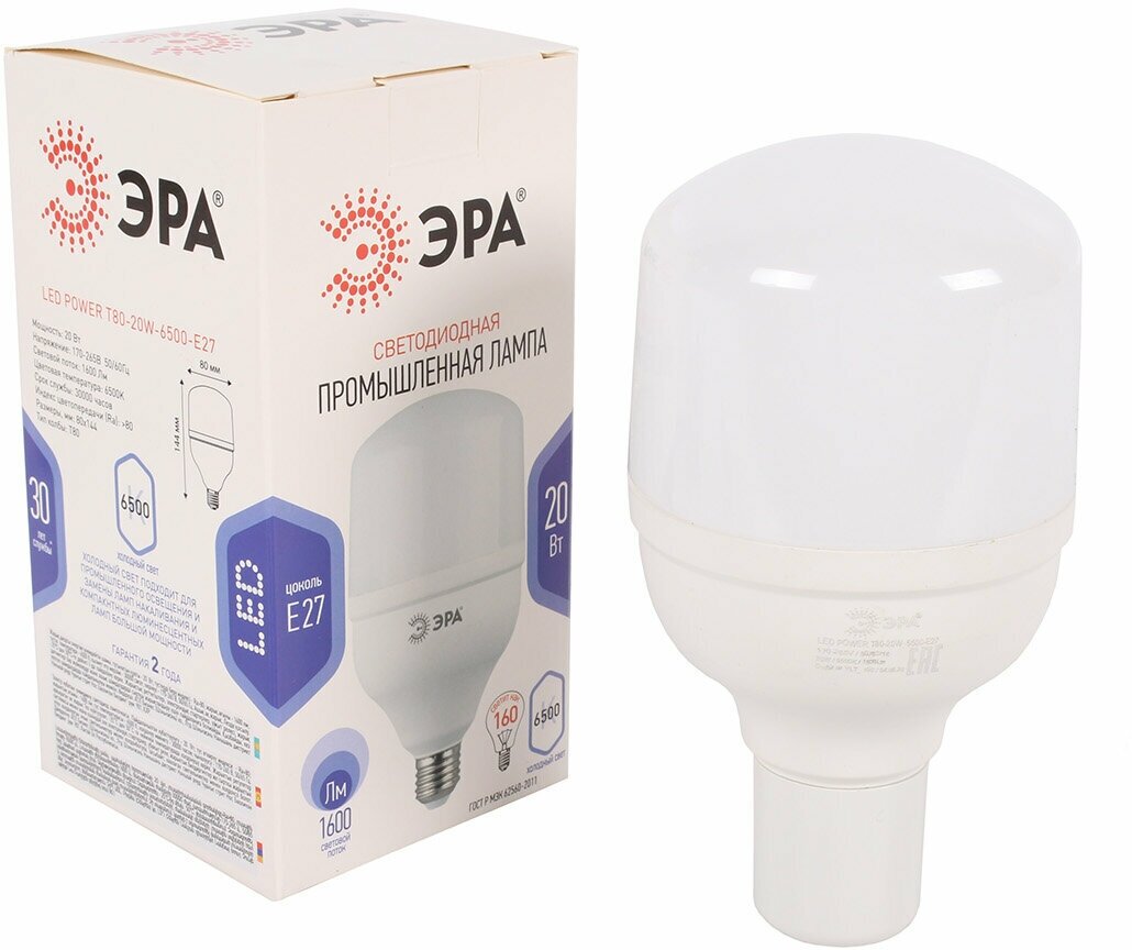 Лампа светодиодная ЭРА Power Б0027011, E27, T80, 20 Вт, 6500 К